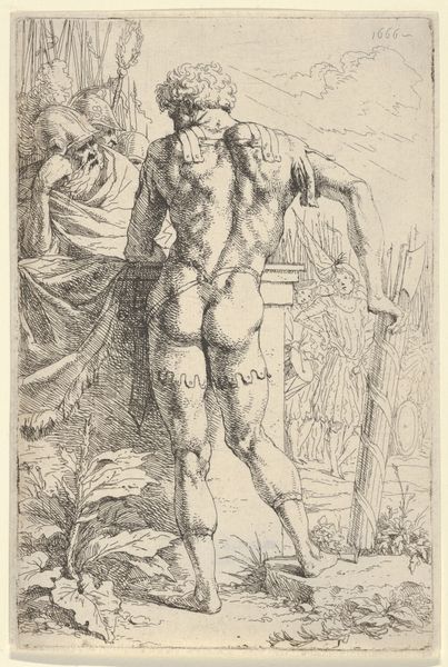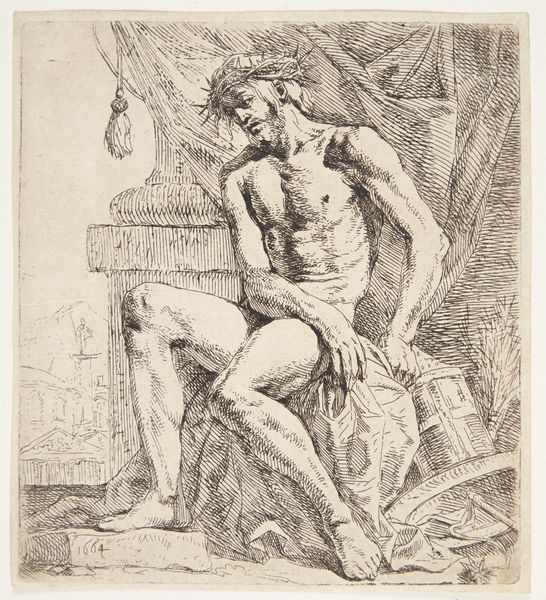 Leendert van der Cooghen created this print, “Sitting Roman Soldier,” sometime in the 17th century. The Dutch Golden Age, the period in which Van der Cooghen was working, grappled with questions of power, trade, and national identity as the Dutch Republic rose as a major maritime force. This etching depicts a seated Roman soldier as he wistfully holds his head in his hand. Behind him, figures emerge from a building’s doorway. As an etching, this work enabled the broader distribution of images, allowing for new forms of social and political discourse. Van der Cooghen’s choice to depict a Roman soldier also evokes the complex relationship between the Dutch Republic and its classical forebears. The Republic often looked to the Roman Republic as a model for its own political structures. But the emotional register here complicates any straightforward glorification of empire. The image of the soldier, weary after battle, taps into the experiences of those caught in the conflicts of the era. This work reminds us that even in moments of national pride, we can reflect on the emotional toll of those historical narratives.
