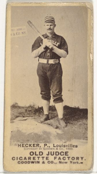 Curator: So, this is “Beckley, 1st Base, St. Louis Whites,” an 1888 Old Judge Cigarettes baseball card. Goodwin & Company made it, and it's a photo-based print. Editor: It’s so interesting seeing what was essentially an advertisement elevated to art. The player seems so serious! How should we read this piece today? Curator: Well, let's think about the context. It’s a tobacco card, right? So, immediately we need to consider how the burgeoning commercial market shaped not only what was *depicted* – here, a burgeoning sport and celebrity athlete – but *how* it was depicted. These cards weren't fine art prints; they were churned out en masse. Editor: You’re talking about production. Like the conditions for those making the photographs and prints and then selling the cigarettes? Curator: Exactly! Consider the labor involved at every step, from the factories producing the cards and cigarettes, to the very baseball Beckley used to play the sport and attract this attention in the first place! It invites questions about labor and even exploitation related to these activities and the creation of leisure and commodity culture. What do you make of this baseball "genre-painting", if we can call it so? Editor: The material conditions give it meaning. The rise of mass media intersects with early baseball...I hadn't thought about that! These were clearly produced in huge quantities to be stuck into products for advertising, reaching all sorts of people. It's art in service to commerce and the popularisation of a particular idea of the 'all-American' athlete. Curator: Yes. And in that regard it’s quite democratic, isn’t it? Perhaps more "realist" than academic painting by making representation accessible and reproducible for the masses? Editor: I suppose you're right! Thinking about how the mass production and circulation of this card made it into something completely different over time. Thank you for shifting my perspective on this photograph. Curator: My pleasure. Looking closely at the materials and the modes of production helps us unpack so much more than just the image itself.