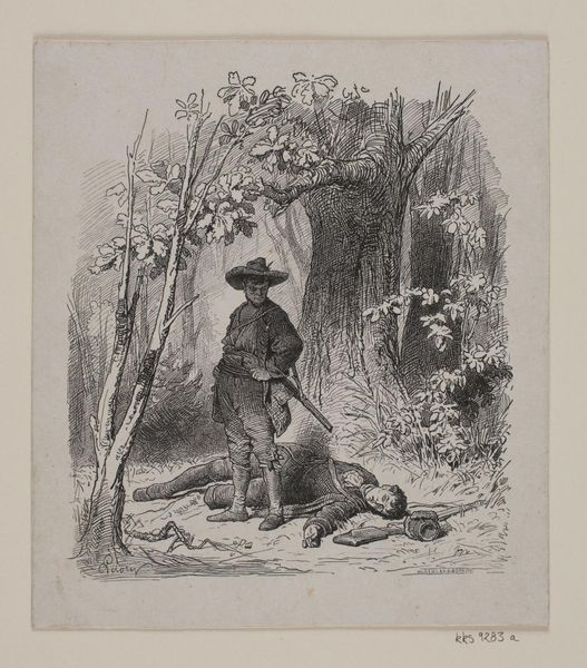 Editor: This is a drawing called "Don Quixote," by Gustave Dore, and seems to be created using ink, likely a woodcut or print. The dramatic landscape makes quite an impression, particularly the contrast between the meticulously rendered trees and figures. How do you interpret this work from a formal perspective? Curator: A thorough question. Focusing on the formal elements, observe how Dore uses contrasting textures to create depth. The fine, detailed lines in the foreground grasses play against the dense, almost overwhelming texture of the forest. Consider how the composition leads our eye—from Don Quixote, with his verticality and stark lines, to the reclining Sancho Panza. Do you perceive how that directional vector interacts with the dense surrounding forest? Editor: Yes, the diagonal line formed by Don Quixote's spear is very pronounced, but the forest does seem to enclose them. Why does Dore create that kind of density and darkness with the woods? Curator: Dore's skillful use of light and shadow adds emotional weight, does it not? Note that by emphasizing the texture, Dore essentially flattens the depth. Ask yourself what kind of flatness the image suggests: does it highlight any artificiality? Or call to attention our limited vision of our worlds around us? How is your experience when viewing this image being emphasized by these aspects? Editor: I think it emphasizes the almost dreamlike quality, like we are transported to another world! It also highlights how the figures are small in relation to everything around them. Curator: Precisely! By attending to form, we can apprehend how Dore's visualization makes real abstract concerns about consciousness itself! How rewarding! Editor: This perspective opens up a deeper appreciation of the art of storytelling, and to examine these figures amidst these detailed images. It gives insight not just to a story of fiction, but one that causes deep consideration on the relation between mind and world. Thank you!