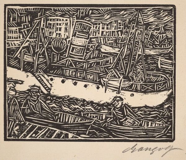 Curator: Paul Gangolf, a name perhaps less familiar to some, created this dynamic print titled "Vintemille." Note the artist favors ink. Editor: My immediate sense is of organized chaos, or maybe frenetic energy barely contained. The scratchy linework vibrates across the paper. Curator: Gangolf was a keen observer of urban life. Notice how he renders the cityscape. The concentration of structures rises, almost organically, a kind of constructed hillside crowned by what looks to be a church tower. His vision evokes the modernist tendency towards linear expression, eschewing precise realism. Editor: Yes, the materiality really stands out. The repetitive etching must have been arduous, like a controlled form of mark-making, right? It’s not just a depiction of a city, it's also about labor— the labor involved in producing an image through this printing process, the repetitive task. It transforms what could be a tranquil landscape into something more gritty. Curator: The cityscape emerges amidst what looks like a spontaneous layering of ink strokes. In truth, this meticulous print demanded skillful craftsmanship, and in Gangolf's work we see how he elevates traditional means through technique and perspective. His background is somewhat enigmatic, isn't it? But his mark remains clear here. The question of "authenticity" in mass-produced media looms as well. Editor: Authentic or not, the frenetic energy and density give an uneasy sensation that is almost claustrophobic; he conveys the sensation of the cramped buildings pushing into one another. I see that and connect it to the way humans are crammed together as well within city landscapes that don't have planned spacing. This really underscores to me the tangible struggle to bring form out of material in urban experience and in his own artwork as well. Curator: It prompts a reconsideration of modernism's effect on visual interpretation as a form of understanding both in public art appreciation and material culture's reach overall! Editor: Precisely! This is also such a nice moment in an artist's journey to see such a display of both creative intention meeting actual practice.