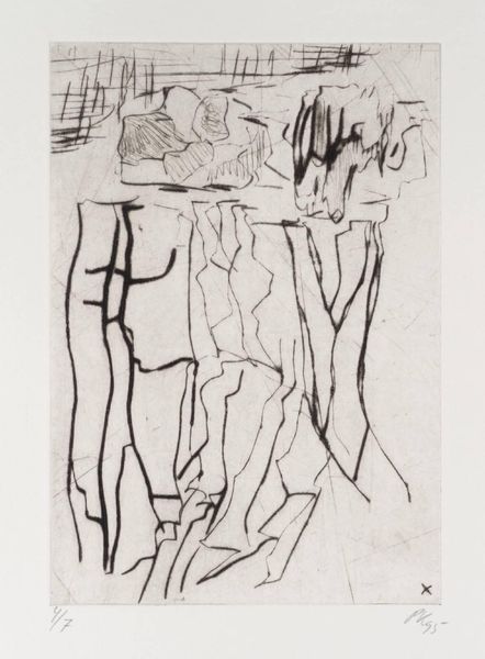 Editor: This etching is "Combat" by Stanley William Hayter, created in 1936. All those frantic lines! The energy is just… intense. It really captures a sense of chaotic movement, but also it is very hard to figure out what is happening here. How do you interpret this work? Curator: What we observe is an exploration of form and dynamism rendered through a cubist and surrealist lens. The interplay of lines carves out an ambiguous space, evoking tension through pure visual means. The artist forgoes the comforts of perspective to create an interesting affect. Do you notice the deliberate intersection and overlap of forms? Editor: I do now that you mention it! The forms intersect almost violently, creating a sense of compression, of struggle. The tonal variations, from the crisp lines to the densely etched areas, give real depth to this mostly monochromatic composition. The shapes only seem to take form for the barest moment, then immediately collapse into a jumble of form. Curator: Precisely. This disintegration is an example of the line acting independently of the objects, effectively deconstructing notions of reality. Note also the contrasting textures; this affects the visual and tactile impact on the viewer. Editor: This almost makes the image tactile! Given when this work was created, I'm wondering whether these artistic and expressive decisions point towards themes of anxiety or a breakdown of society, what do you think? Curator: These thematic interpretations depend on the spectator, however the value is intrinsic. I’d invite you to contemplate the aesthetic structure and let the shapes lead your observation. What have you learned today? Editor: To trust the shapes, to engage with form itself. Thanks for opening my eyes to this interesting interpretation of the piece!
