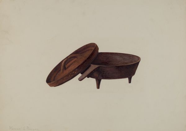 Editor: This is Edna Rex’s “Table,” made sometime between 1935 and 1942, using watercolor and colored pencils. It’s so simple, but there's something kind of lonely about this lone table. What do you see in this piece? Curator: The singularity is striking, isn't it? Focusing solely on a single, rather humble object pulls it out of the domestic narrative. This allows us to reflect on what a table *means*. Historically, the table is a symbol of gathering, sustenance, communion – a site of shared experience. Editor: So the absence of that...sharing... that community aspect, contributes to that lonely feeling? Curator: Precisely. Think about what *isn't* shown. No food, no people, just this lone object rendered with precision. What emotional residue clings to the image in its solitude? This echoes wider themes from that era. The Depression left many feeling isolated, struggling. Editor: So the drawing, maybe unintentionally, becomes about loss? And I'm also curious, with it being watercolor and colored pencil, would that mean this might have been meant more as a study than a final piece? Curator: Potentially. The combination lends itself to detailed observation, almost scientific documentation. But even in documentation, symbolism persists. The deliberate act of choosing *this* table to meticulously record transforms the mundane into something more profound. Do you find the medium affects how you interpret the imagery itself? Editor: It does now! Thinking of it as documentation makes me consider the table itself almost as an artifact, and that draws out that lonely feeling. Like it’s a specimen, the last of its kind almost. Thanks! Curator: It is through thoughtful questions such as these that objects whisper their forgotten histories. Thank you for considering such a complex web of possible readings.