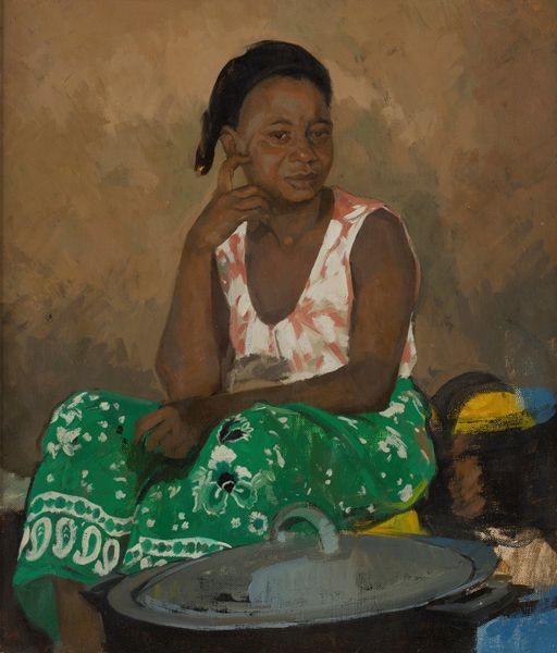 Editor: So here we have Amy Sherald's "The Boy With The Big Fish," painted in 2016, using acrylic on canvas. There's something really striking about the central figure. He seems calm, yet there is something unsettling about the gray-scale skin tones set against this bright green backdrop, like a memory fading in the sun. How do you interpret this work? Curator: Ah, Amy Sherald, she is so good at arresting moments! For me, this piece speaks to a quiet pride and maybe, just maybe, a little hint of magic realism. Think about it - the grey skin tones... Sherald does that to play with identity, doesn't she? Almost like the subject is claiming ownership of their space and being, outside the constraints of what others may project. And that fish—look how prominently it’s displayed; it's not just about the catch. It’s about proving resilience, skill. It adds an amazing sense of narrative potential! What feelings does the fish evoke in you? Editor: It’s an interesting point that you make about proving resilience and identity…It hadn’t occurred to me. Curator: See? And what do we see hanging out the top of the overalls. Hahahaha, is that his handkerchief or is he wearing it as an accouterment? What about that casual swig he's got there, too. There's so much symbolism in her art. Now, doesn't that background remind you of 60's album covers and childhood summers? Editor: Definitely, this has given me a much deeper understanding and appreciation for Sherald's piece! Curator: Right?! This whole thing plays on contrasts, doesn't it? Familiar and slightly…out of whack. Like a dream you can almost grasp, before it slips away with the tide. And just like that...Art.