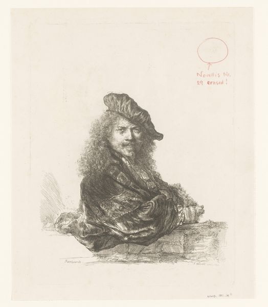 Editor: This is *Self-portrait leaning on a stone sill*, etched by an anonymous artist around 1639, and currently held at the Rijksmuseum. There's an intimate feel to it, almost casual, yet the clothing is so detailed. How do you read the symbolic nature of self-portraits like this? Curator: That's a great starting point! It is like looking into the artist's soul, isn't it? Consider the “stone sill” – a liminal space. He's leaning, relaxed but observant. Think of Baroque art as theatre; what role is the artist playing? And the eyes--are they challenging us or inviting us in? Editor: I see what you mean about a theatre. I guess I'm not sure if there's a "role" besides that of an artist looking at himself. Curator: Exactly, but it's a constructed image, carefully composed. His attire, that fantastic beret and robe—do these signify artistic identity or status? Remember, clothing in portraits can be very performative. Think also about light and shadow –notice how much they emphasize a dramatic unveiling. Editor: I never thought about that much intention behind what he was wearing; I'm thinking more now about how deliberate these choices are. The shadow feels particularly effective in this composition. Curator: Absolutely. And it all boils down to legacy. Self-portraits allow an artist to control how they will be seen, and remembered. In the 17th century, this would be particularly resonant. How do you think this etching speaks to ideas about the artist as an individual? Editor: This makes me rethink self-portraits; it's like the artist is crafting their persona for posterity, selecting particular visual and symbolic languages. Thank you, I learned so much about self-portraits! Curator: Likewise; viewing portraits with symbolism is key, I believe, to accessing richer contexts.