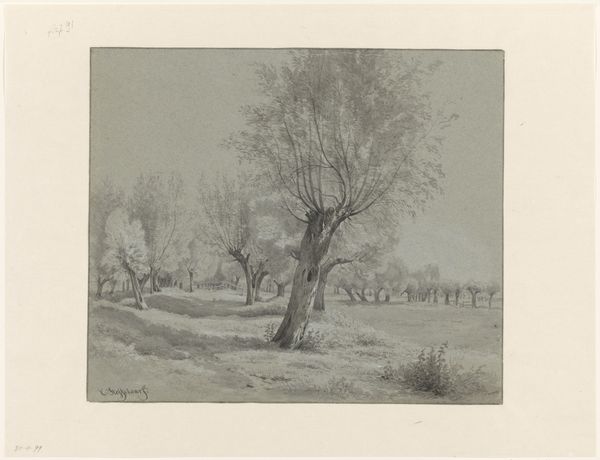 Editor: This is "Huizen in Bosvoorde" by Adrien Le Mayeur de Merprés, dating from sometime between 1854 and 1911. It's an etching, a small black and white print of houses nestled in a landscape. There’s something about the starkness of it that feels both peaceful and a little unsettling. What do you see in this piece? Curator: The cultural memory embedded in landscape imagery like this is profound. Consider how these humble houses, rendered in such precise detail, represent a connection to place, to community. The thatched roofs, almost like protective shells, remind us of human resilience. But the starkness… it evokes the weight of generations who have lived and toiled there. Editor: The 'weight of generations' – I hadn’t thought of it that way. I was just reacting to the lack of color, the almost severe lines. Curator: Exactly! The artist’s choice of black and white removes the distraction of color, forcing us to confront the essential forms. The bare trees, too. Do they signify something to you? Editor: They make me think of winter, of dormancy, maybe even loss? Curator: Perhaps. They could also represent a hope for renewal, the promise of spring. Notice how they point upward, creating a visual link between the earth and the sky. Landscape isn't just physical space; it’s also a symbolic realm, a canvas upon which we project our hopes and anxieties. Editor: I see that now, the way the landscape holds so many potential meanings. I initially focused on just what was in front of me rather than how it carries history and feelings. Curator: Indeed. Images like this remind us that every place is layered with stories, waiting to be deciphered. The etching medium is also significant in its cultural symbolism relating to production and documentation. Editor: This has completely changed how I view the image! I appreciate the perspective on how everyday scenes are filled with so much meaning, generation after generation.