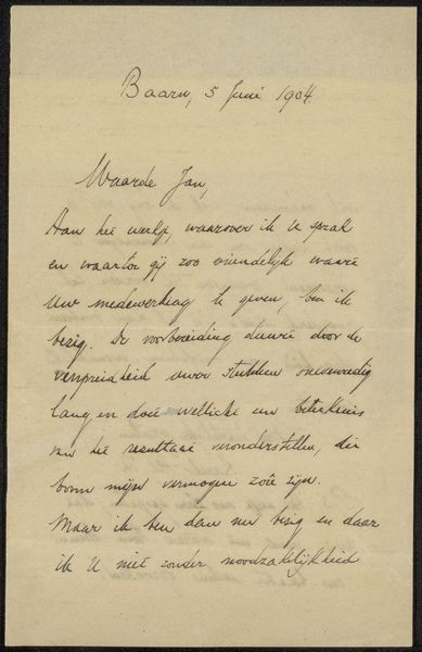 This letter was written in 1911 by Jan Veth, and addressed to Cornelis Gerardus 't Hooft. It's a beautiful example of cursive handwriting, made with ink on paper. The very act of handwriting, especially with the use of a fountain pen, implies a degree of care and attention. It's a process that invites you to consider the author's thoughts as they slowly take form on the page. Unlike today's digital communication, handwriting leaves traces of the writer's personality: the pressure of the hand, the rhythm of the strokes, the flourishes and occasional blots. The letter form itself speaks to a slower, more deliberate era. Before email, personal correspondence was a primary means of maintaining relationships. The materiality of the letter – the weight of the paper, the texture of the ink – added a tactile dimension to the communication, something lost in our age of instantaneous digital messaging. It is this element of the handmade that elevates this letter from a simple piece of correspondence to a work of art, in its own right.