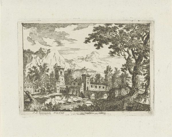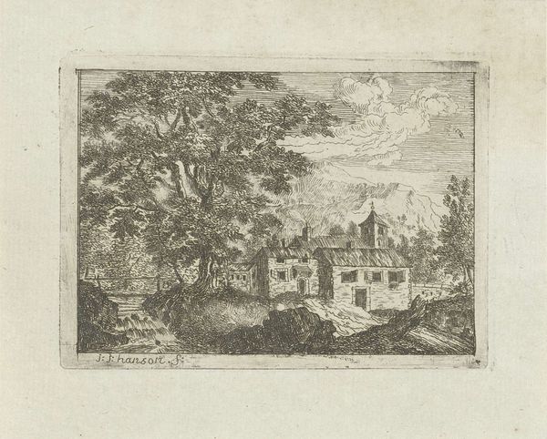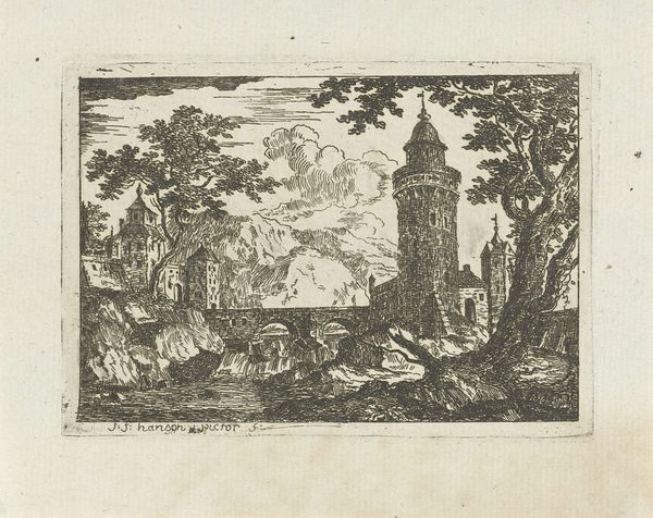 This print, "Kasteel in een landschap" or "Castle in a Landscape," was made by Jean Joseph Hanson in the late 1700s using etching. Etching involves drawing with a sharp needle through a waxy ground on a metal plate, which is then submerged in acid. The acid bites away at the exposed lines, leaving an image that can then be inked and printed. The fine, precise lines we see here are characteristic of this process. Hanson has skillfully used the etching technique to depict light and shadow, creating depth and texture in the trees, the castle walls, and the distant hills. This attention to detail transforms the image into more than just a picturesque scene; it is a testimony to the artist’s mastery and the labor-intensive process of printmaking. Thinking about the material qualities and production of prints like this helps us appreciate them not just as images, but as objects imbued with cultural meaning. This challenges the traditional hierarchy that often places painting and sculpture above so-called 'minor' arts like printmaking.