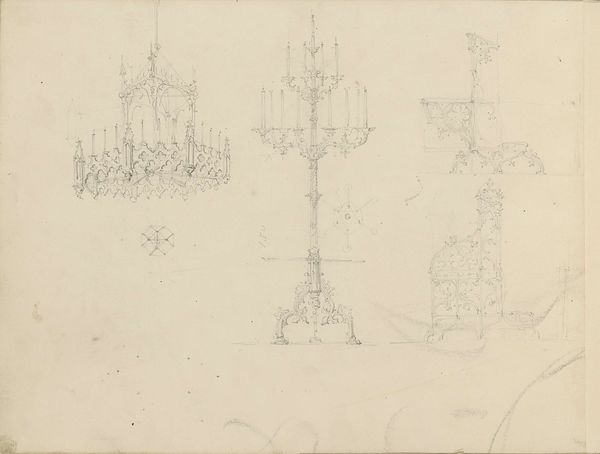 Pierre Joseph Hubert Cuypers sketched this study sheet of chairs, tables, and a baldachin using graphite. The baldachin, with its draped canopy, echoes the ancient Roman "baldacchino," a symbol of authority and sacred space. The baldachin's form—a canopy held aloft—has roots stretching back to ancient royal canopies, representing power and protection. Consider its evolution: from the ceremonial parasols of Eastern rulers to the elaborate structures over papal altars. This motif has journeyed through time, each era layering new meanings onto its frame. The image elicits feelings of reverence and respect, engaging us with symbols that tap into our collective memory. These motifs, repeatedly conjured in art and architecture, weave themselves into the fabric of our cultural consciousness. They resonate in our subconscious, evoking emotions that transcend time. Like a recurring dream, the baldachin resurfaces, each time slightly altered, carrying the weight of history and the promise of renewal.
