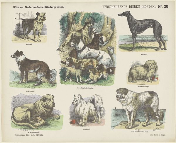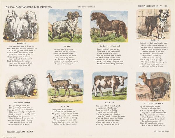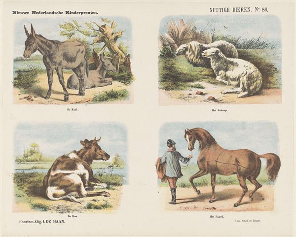 This children's print by Jan de Haan presents scenes of domesticated animals, each imbued with symbolic weight. Consider the loyal dog, a "Fidel op Wacht," guarding his master’s belongings. The dog, from antiquity to the present, has been a symbol of unwavering fidelity. Think of the ancient Roman mosaics, where dogs are depicted as guardians of the home. But here, the dog rests beside a discarded glove and book—items that suggest a master nearby. Consider too the cow, "Op de Weide" awaiting its fate in the pasture. The cow, with its ancient association to fertility, has been reduced here to future butchery. We witness a cyclical progression, echoing through time. This illustrates the powerful, often subconscious, emotional and psychological forces that connect us to these images.