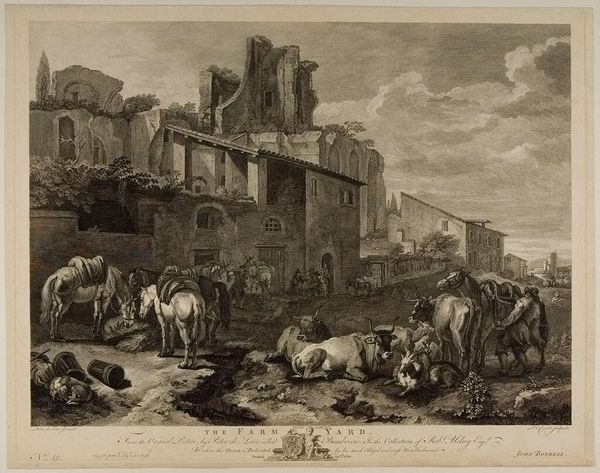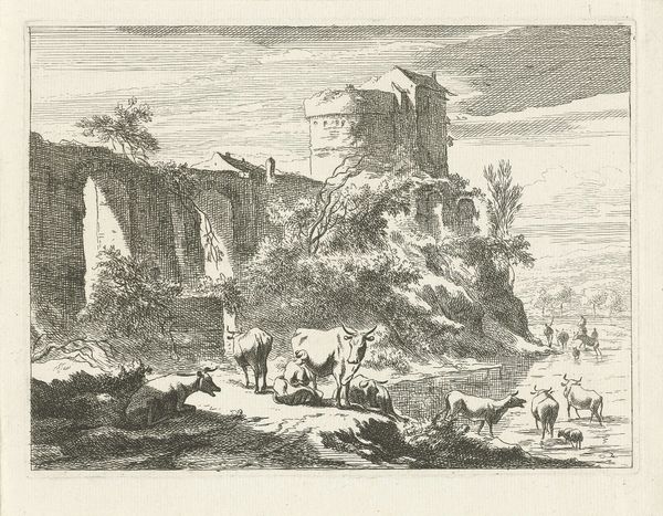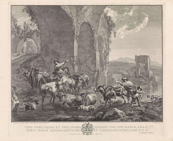 Editor: So, this engraving, "Italianiserend landschap met herders en vee" by Abraham Delfos, dating roughly from 1741 to 1820… The detail is striking. I am drawn to the textures; they almost feel tactile despite being a print. What do you make of the artist's choice to depict such a scene using engraving? Curator: Considering the materiality of engraving at that time, it becomes quite clear. Engraving allowed for mass production, spreading the image of the Italian ideal to a broader audience. We can investigate who profited, how it was distributed. Note the labor that was necessary for producing this plate in series; how does this change your perception of it? Editor: That's fascinating! The “Italian ideal” available as a reproducible commodity... almost like a landscape postcard. It highlights accessibility, but at the expense of perhaps the artist’s hand? Curator: Precisely. Delfos isn’t just representing a scene. He’s participating in a system. What was the function of such imagery in that era, and for whom? Consider who would purchase this. Did they see the landscape as mere documentation? Did it have more utility or something beyond? Editor: Maybe it reinforced the status of wealthy landowners, or inspired longing amongst those who would never have such opportunities. So the value isn't purely aesthetic, but linked to social and economic power. Curator: Exactly. How does understanding the processes involved—from Delfos's workshop to the merchant's shop to the customer's house—alter your interpretation of this idyllic landscape? What does this choice of mass produced art say about access to landscape as subject matter? Editor: It makes me think about art and production. The materials and the process aren’t neutral; they're deeply embedded in a particular context. This connects art directly to the culture surrounding its making. Thank you for changing my perspective! Curator: And thank you. Recognizing art as bound to materials, labor, and market illuminates art's vital links to society.