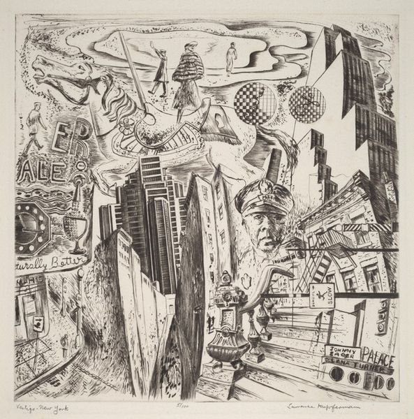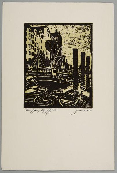 Fiske Boyd made this dynamic print called New York, and you can see that the whole image is built from carefully placed marks that create a really cool sense of depth and energy. It’s all about how the artist approached the material, like each cut is a decision, a little performance. Check out how the black and white spaces play off each other to suggest the towering buildings and rushing traffic. The texture is amazing because you can almost feel the pressure of the tool Boyd used to carve out the image. There's this one part, right in the foreground, where the lines curve and swirl around the cars, really capturing the movement and chaos of the city. It’s like he’s not just showing us New York, but also the feeling of being there, caught up in its rhythm. It reminds me a bit of the German Expressionist prints, where artists like Kirchner or Heckel used similar stark contrasts and angular shapes to convey intense emotions. Like them, Boyd's print isn’t just a picture; it’s a vibe, an experience. And that’s what makes art so great, isn’t it? It’s not about getting one right answer but opening up to all the possibilities.