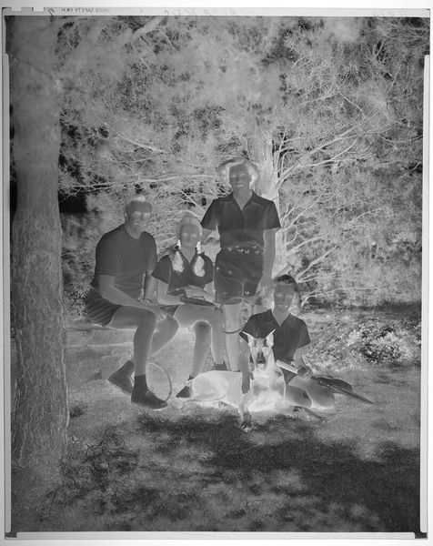 Curator: Let's discuss this intriguing photograph from the Harvard Art Museums, "Untitled (three children in striped shirts posing with dog and goat outdoors)" by Martin Schweig. Editor: It's eerie, isn't it? The inverted tones give it a spectral quality. I am immediately drawn to the materiality of the photographic process itself. Curator: Indeed. The high contrast emphasizes the figures, set against what appears to be a verdant, overgrown landscape. It speaks to how photographic portraiture was becoming democratized. Editor: And look at those striped shirts; mass-produced clothing reflecting wider industrial production that shaped childhood experiences. The inclusion of the animals also hints at specific labor practices. Curator: The animals introduce an element of rural life, contrasting with the children's modern attire, reflecting the shifting social landscape. It almost feels like a performance. Editor: Perhaps, but I see the making of the image, a collaborative act, rather than a simple representation. It’s labor intensive. Curator: I appreciate your perspective. Thinking about the artist's intentions and the socio-economic implications definitely enriches our interpretation. Editor: Right. It invites questions about the very fabric of daily life.