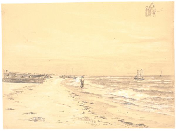 Editor: Here we have Gustav Goetsch’s "Beach Scene," probably created sometime in the early 20th century. It’s a small watercolor, a very unassuming little piece, yet I find the layering of washes so compelling. What catches your eye in terms of its materials and production? Curator: What strikes me is Goetsch’s use of watercolor, a medium historically relegated to sketches and preparatory studies. By presenting it as a finished work, he subtly challenges the traditional hierarchy of artistic materials and the perceived value of different forms of artistic labor. Notice the translucency, the grain of the paper – how does this materiality inform the overall feel of the piece? Editor: I see what you mean. The sketch-like quality lends it immediacy. Is there also something to say about his choice to depict the beach, a space of leisure? Curator: Precisely! Consider the social context: who has the time and resources to frequent such a place? Leisure is itself a form of labor. And how does plein air painting, like we see suggested here, connect to class? Think of the accessibility and transportability of the materials. The materials themselves dictate much of what can be created. Do you agree? Editor: Yes, it seems like Goetsch’s approach challenges the formal conventions of landscape painting. By embracing what was thought to be disposable, preliminary artistic acts, he's elevated the mundane. So we can understand it through his specific actions and tools. Curator: Absolutely, by examining the 'how' of art-making – the labor, materials, and consumption – we uncover hidden meanings and challenge established norms, instead of thinking about aesthetics alone. Editor: I never thought about beach going and plein-air painting that way before. Thank you for the insight! Curator: It's a different way to view artworks, I’m glad I could illuminate Goetsch’s choices in this painting!