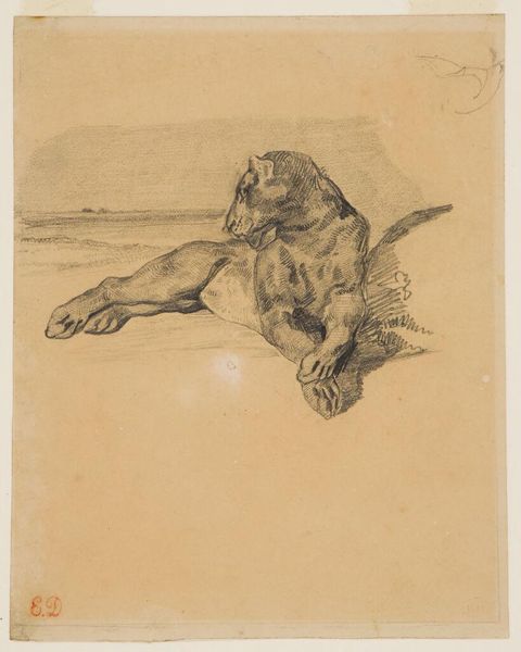 Edwin Landseer sketched this lioness sometime during the 19th century. During this period, the British Empire’s colonial power extended to Africa, the natural habitat of lions, which in turn triggered Western fascination with the exotic animal. Landseer was well-known for his animal paintings and sculptures, and was considered an expert in animal anatomy. Here, the artist renders the animal with detailed strokes, capturing her muscular physique and quiet, observant gaze. Lions, often a symbol of royalty and strength, were associated with British imperial power. Landseer's choice to depict a lioness, the female of the species, opens up a space to consider the powerful role of women, and even perhaps an alternative perspective on imperial power. Notice the animal’s calm demeanor and contemplative stance. Landseer invites us to consider the complexity and dignity of this creature, beyond her symbolic meaning. Through this drawing, Landseer perhaps prompts us to reflect on our relationship with the natural world, and to understand the powerful female presence in British society.