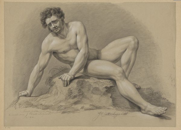 Editor: This is *Male Nude Seated on the Ground* a charcoal drawing by Louis de Boullogne the Younger, created in 1702. I’m immediately struck by how sculptural the figure appears, almost like a drawing of a sculpture. What can you tell me about this work from a more structural perspective? Curator: Let’s observe the composition itself. Notice how the artist utilizes the fall of light and shadow to model the figure. See how this interplay doesn't merely depict the figure's form but generates volume? Editor: Yes, I see that the strong chiaroscuro really defines the muscles and gives him that three-dimensional quality. Curator: Precisely. Also note the pose itself: the twist in the torso, the placement of the limbs. It introduces a dynamic tension to the work. Consider too, the relationship between the figure and the ground, or plinth, as a locus of tension. Editor: So the emphasis is on the formal elements, how line, shadow, and form interact to create the effect, more so than what the figure represents? Curator: The semiotics embedded within—line, form, tone, volume, pose and medium—is precisely the point, or the meta-point from which the possibility of an understanding commences. Dissected by the analyst, it speaks back at a more advanced stage of the procedure. Are you discovering a renewed, emboldened awareness as you look at art? Editor: I am! Looking at it this way, it almost feels like decoding a language. I'll certainly think about it next time.