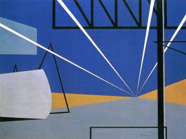 Editor: Standing here, we're looking at Stuart Davis’ "Egg Beater No. 4," an oil on canvas from 1928. What strikes me is the flatness, how he uses these bold colors to almost build a shallow stage. What are your thoughts, how do you interpret this work? Curator: It presents a fascinating study in form and space. Notice how Davis abandons traditional perspective, favoring instead a layering of geometric shapes. Consider the interplay between the positive and negative space. Does the arrangement create a sense of depth, or does it intentionally flatten the composition? Editor: I see what you mean. The lines create implied shapes, but it is not easy to get a sense of where everything begins or ends. I thought he used color, line and shapes just to celebrate "abstract form". Curator: Indeed, color plays a pivotal role. Observe the carefully chosen palette. Are the hues harmonious or clashing? And how do they affect your emotional response to the painting? Also, regarding shapes and lines, one could delve into a semiotic analysis. Editor: Semiotic analysis? I see it now, you mean treating those geometric shapes almost like language elements. Like, the lines aren’t just lines—they are also boundaries or connections? Curator: Precisely. Each element contributes to a system of signs, inviting the viewer to decode its meaning. Is the artist intending to represent something tangible? Or is this simply about exploring pure abstraction? Editor: I guess it makes sense now. So he uses recognizable things like egg beaters as just one starting point for lines and colors to stand in for larger feelings, or other, more complicated objects. I had not seen it that way, thinking of the image just on its face. Curator: Precisely. So how has this approach influenced your understanding of "Egg Beater No. 4"? Editor: It opened up an entire system. I’m thinking of the work differently now, thank you! Curator: Indeed, analyzing Davis' technique will likely deepen your relationship to modern art and abstract forms.