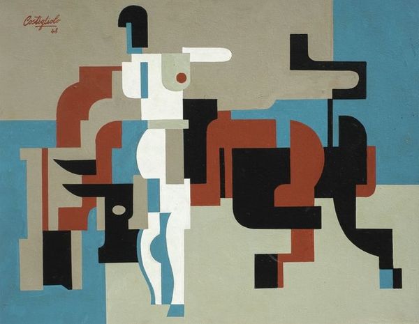 Editor: We're looking at Arshile Gorky's "Mechanics of Flying," an oil painting steeped in abstraction. It feels… almost like a blueprint, but one where the machine parts have come delightfully, almost comically, undone. What do you see when you look at this piece? Curator: Oh, "undone" is perfect! It reminds me of peering into my grandfather's workshop, a beautiful jumble of tools and half-finished contraptions. Gorky’s art often felt intensely personal, a dance between memory and invention. See how the geometric forms soften into biomorphic shapes? It's as if he's dismantling the rigid structures of the modern world and letting something more organic seep in. Does it evoke any particular sensation or feeling in you? Editor: It does, actually. I get a sense of… potential. Like these shapes could become anything. A machine, yes, but also something else entirely. The name “Mechanics of Flying” gives me the sense of reaching higher or further somehow. Curator: Exactly! And that reaching… it's not just about physical flight, is it? Think about Gorky's life. An Armenian immigrant who escaped genocide, rebuilt himself as an artist. "Flying" could be about transcending trauma, transforming experience into art. Look at that contrasting palette—the grounded browns and blues fighting against the upward-reaching reds and whites. It's a constant striving, isn't it? Editor: I hadn’t thought about it like that before. That context really shifts my understanding of it. What was initially a purely visual exercise for me, something cool to look at, becomes something much more human. Curator: And that, my friend, is the beauty of art. It’s not just what we see, but how it makes us *feel* seen, too. It's about recognising our own potential for flight, for transformation, within these very human “mechanics." Editor: That’s beautifully put. I’ll never look at abstract art the same way again. Thank you for sharing your perspectives!