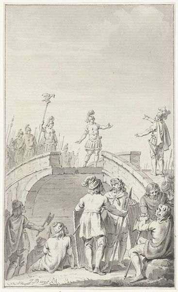 Curator: This engraving, made in 1788 by Reinier Vinkeles, depicts "Civilis en Cerialis onderhandelen op de afgebroken brug, 69-70", an event rooted in the Batavian revolt against Roman rule. Editor: Immediately, I notice the stark division within the composition. The fractured bridge becomes a powerful symbol, physically separating the Roman general Cerialis from Civilis and his Batavian forces. There's an undeniable tension in this standoff. Curator: Vinkeles uses a neoclassical style to represent a moment of historical negotiation. But it's worth remembering that engravings like this also had a role in shaping national narratives, particularly in the late 18th century as concepts of nationhood were crystallizing. The Rijksmuseum is lucky to have this on view. Editor: Absolutely. It raises the crucial question: whose story are we being told, and to what end? Vinkeles lived in a time when the Dutch Republic had collapsed, replaced by the Batavian Republic installed by French Revolutionary forces. I am certain this scene resonated with the anxieties surrounding authority, foreign occupation, and the desire for self-determination. Curator: Precisely. And you can see this in the careful depiction of the figures. The Roman, Cerialis, seems regal in a toga, almost untouchable, whilst Civilis, surrounded by his compatriots, occupies a more ambiguous stance—simultaneously defiant and perhaps pragmatic? The bodies show a moment in time for conflict. Editor: What is striking is that you have two power brokers meeting, but so many foot soldiers are also involved. You have the regular men here and some appear war torn, tired, injured or scared. It brings to question the impacts of colonialism, a topic for current political theory, that is seen to stem from this original Roman and Batavian feud. Curator: These are really interesting aspects, and it reveals something about Vinkeles' technical skill and artistic license that is able to bring such commentary to this medium. Editor: Agreed. And with that, the work stands as a testament of political commentary that stems to this current moment in society. Curator: Definitely, a brilliant and thought-provoking engraving!