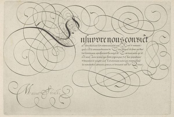 This is "Schrijfvoorbeeld met kapitaal C," made by Hans Strick sometime in the late 16th century. The work presents an example of calligraphy, showcasing elaborate swirls and elegant letterforms in ink on paper. During Strick’s lifetime, the Dutch Republic was in its infancy, a society in the throes of defining its cultural identity through language and art. Calligraphy held a place of importance, valued not just for its function but also as an art form. Note how the flourishes and the composition’s layout create a visual rhythm. The curves around the text almost seem to dance. Identity is subtly woven into this piece. While it's a demonstration of skill, it also reflects Strick’s cultural milieu and his aspirations as an artist working in a time of social and artistic change. How does this work strike you? Is it purely decorative, or does it evoke deeper reflections on language, skill, and cultural identity?