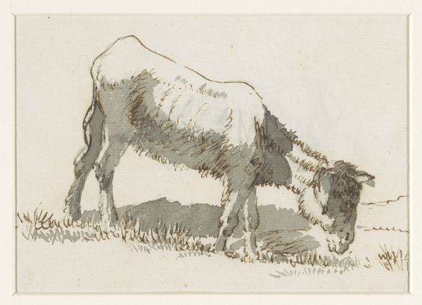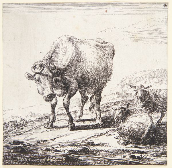 Curator: Here we have Nicolaes Berchem's "Standing Ram and Lying Sheep," created sometime between 1620 and 1683. It's an etching. What’s your first impression? Editor: A pastoral sort of melancholy, maybe? I mean, it’s rendered with such spare lines. The ram looks a little rough around the edges. Curator: Note the technique. Berchem used etching to create a texture mimicking a pen sketch. Observe how he suggests volume through the density and direction of lines, particularly on the standing ram's wool. Editor: Yes, that ram’s fleece… It almost feels like he’s wearing a slightly disheveled coat. And the lying sheep, so still. Is it simply resting, or something more? The stark contrast of active and inactive, life and… well, potential lack of it. Dramatic stuff using only lines. Curator: There’s a dynamic interplay there. The formal rigor of line meets a bucolic subject. It elevates a simple farm scene using the conventions of Baroque art, which emphasizes depth, movement, and strong contrasts. Notice the precise rendering of the horns compared to the softer body of the sheep. Editor: Right. That almost sculptural precision gives the ram a strength. Those horns are formidable. Yet, there's vulnerability in how the etching shows every tuft and scruff. It’s not idealized, it's really there. A Baroque snapshot of rustic life. Did Berchem do more of these farmyard portraits? Curator: Quite a few, yes. He had a fascination with the rural, treating it with the same level of detail and skill often reserved for more ‘grand’ subjects. He dignifies this animal with observation. Editor: Dignity is the right word! Seeing it this way makes you ponder about your own life and impact. Makes you wonder: what’s the state of *my* fleece? Okay, kidding, but there's definitely an emotive charge within this minimal composition. Curator: It transcends mere representation. The formal control of line amplifies the narrative of nature itself. Editor: In its quiet, understated way, it presents a timeless commentary on the simple truths of existence. A very nice rendering of the fleeting beauty of rural simplicity. Curator: Indeed, and its technical mastery ensures that Berchem's vision persists, reminding us to value the world around us, both wild and domestic.