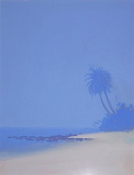Editor: Here we have "Beach with Palm" painted in acrylics, author not specified. What immediately strikes me is the near-monochromatic, somber mood, the blue is intense. What do you see in this piece? Curator: It's an interesting subversion of the typical tropical landscape, isn't it? Usually we associate beaches with bright, saturated colours, sunshine, leisure, and yet this muted palette evokes a different kind of feeling. How does this stylistic choice influence our understanding of leisure, or paradise? Perhaps it reflects a more complicated relationship with these spaces, considering themes of colonialism, environmental exploitation, and the commodification of nature. Think of the romanticisation of the "exotic" in art, how it often erases the realities of local populations. Editor: That's fascinating. So you're saying the painting challenges our expectations of a "happy" beach scene? Curator: Exactly. It prompts us to question who gets to experience this paradise, and at what cost. Consider how tourism impacts local communities and environments, transforming natural landscapes into sites of consumption. The absence of people in the painting could also be significant, no? Are we meant to see this beach as pristine and untouched, or deserted, reflecting a deeper sense of alienation? Editor: That makes me reconsider my initial response entirely. I was just seeing it as a stylistic choice, but I hadn't thought about its historical implications, and that helps it all make sense. Curator: Art has this powerful ability to conceal political meaning behind beauty, a trick, like the "white cube" of a gallery: Who decides which messages can come in and what meanings can take place? Editor: Definitely, I see it in a new light now! Thanks for this intervention, its implications, so simple at first, have left me speechless! Curator: Likewise, your observations offer new perspectives on my work as well.