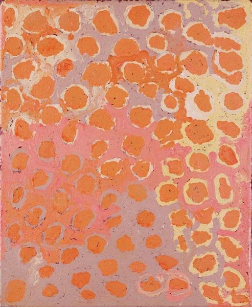 Curator: What strikes you about this piece? For me, it hums with life – a real tangible, organic kind. It’s Makinti Napanangka’s 'Kungka Kutjarra', which translates to 'Two Women', created in 2000 with acrylic on canvas. Editor: Initially, I see a sun-drenched landscape, but somehow… contained. Like a memory or a dream. There is a controlled vibrancy, if that makes sense. Curator: I think it does. Napanangka uses these looping forms, this sort of cellular motif that makes me think of country, of interconnectedness, not just of people, but of land and story. It’s a microcosm. Editor: Precisely! The colours, mostly ochres and yellows, those are classical earth tones. But they also strike me as cartographic – perhaps representing ancestral lands and the journeys across them. I see patterns within patterns here that create a complex visual encoding. Curator: And the layering of the paint! It is very thick in places, almost sculptural, and creates a kind of topographic effect of high and low. It's not just seeing the land; you can practically feel it. I believe Napanangka, you see, came to painting quite late in life, in her 70s! So there is such a beautiful rawness in the mark making, she wasn’t beholden to decades of artistic conditioning, so there’s freedom, which is very apparent. Editor: Right, and the circles. These hold incredible significance, representing sites, waterholes, meeting places – vital points in both the physical and spiritual landscape. Each mark becomes a tiny repository of collective experience. These markings become palimpsests – visual signifiers building up a cultural record over time. Curator: A palimpsest, that is beautiful, you have found the correct words to articulate how each application of the brush is loaded. How Napanangka almost channels something far older than herself in these forms, creating a kind of visual archive that transmits culture, place and time simultaneously, from her fingers directly on to the canvas. Editor: Absolutely. It goes beyond mere representation; it's about the tangible embodiment of cultural memory, which holds echoes of lived experiences through colour and abstract pattern. Curator: What a reminder of how art transcends simple visual pleasure. It offers a deeper insight into cultural narrative and individual experience, when we spend enough time reflecting on what is on view. Editor: Yes, it demonstrates the strength and emotional power behind visual symbols. A very insightful encounter, indeed!