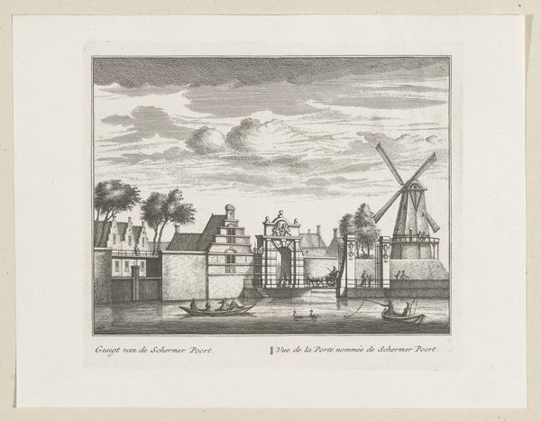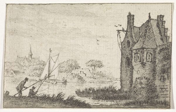Editor: Here we have a 17th-century etching titled "Building with a dilapidated tower by a drawbridge." It's by an anonymous artist and is currently held at the Rijksmuseum. The scene feels incredibly still, almost frozen in time, despite the presence of figures and a working drawbridge. What do you see in this piece, looking beyond just the surface details? Curator: The etching feels steeped in symbolic weight, doesn't it? Notice the ruined tower. Towers often represent ambition, aspiration, and defense, but in its dilapidated state, it suggests a past glory, a decline, perhaps even a warning against hubris. How do you think the presence of the drawbridge functions as a symbol here? Editor: I hadn't considered the tower in that way! With the drawbridge, I guess it seems to point toward connection and transition, but also to division, maybe an active guarding of what is within the city from what's without? Curator: Precisely! The bridge is the active connection, yet it requires constant human intervention. The little figure operating the bridge contrasts with the stillness of the buildings, reminding us of human agency, but also fragility against the backdrop of history, decline and memory embedded within the architecture. Doesn't the combination tell a larger story of power, trade and possible isolation? Editor: I can see that. So, it's not just a snapshot of a place, but a commentary on the times? It’s amazing how much depth is conveyed through what seems like a simple sketch! Curator: Absolutely. Each element, the bridge, the crumbling tower, even the boats, resonate with historical echoes. Paying attention to those echoes is key. We glimpse here cultural memories surrounding Dutch trade empires as well as constant vigilance. Editor: Looking at the buildings and landscape with these symbols in mind, I get a richer, more layered view. Thanks, I hadn't really seen this complexity at first glance.