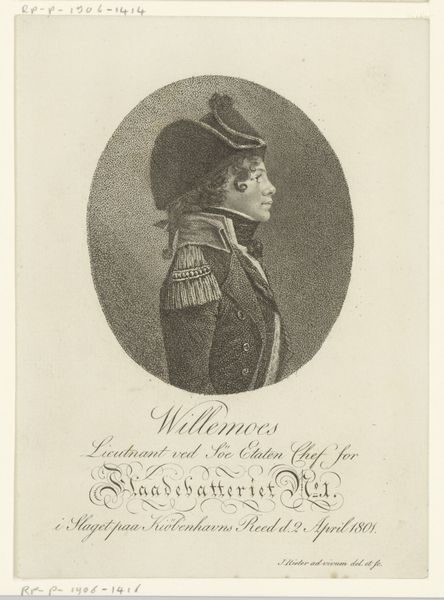 Curator: Here at the Rijksmuseum, we have a captivating engraving, "Portret van H.H. Kofoed," created by Johann Jakob Rieter sometime between 1801 and 1823. Editor: My first thought is somber elegance. The precise lines, the shading… it feels very formal, almost austere, yet there’s a human presence struggling to peek through. Curator: Indeed. Rieter's choice of engraving allows us to explore the reproduction and dissemination of images in that period. Engravings made it possible to produce multiple copies, extending the reach and influence of portraiture. Think about the socio-economic implications! Editor: Absolutely. And placing it within a socio-historical context reveals volumes. Look at Kofoed’s uniform, indicative of status and authority within a rigidly structured society. What power dynamics were at play when representing individuals like him? Curator: The details of his attire – the elaborate hat, the frogged coat, and the epaulettes – speaks volumes about craftsmanship and material culture during that time. One can analyze the production and trade routes that made such garments possible, a whole system of labour that portraiture often conceals. Editor: And beyond just documenting a likeness, it's shaping narratives of power. These portraits served to reinforce societal hierarchies and legitimize authority, all wrapped up in artistry. The engraving as both artwork and propaganda tool, wouldn’t you say? Curator: I think it fair to suggest that while there might have been some intention to represent authority it simultaneously presents material realities about access, display, and economic class distinctions that circulated through the system of making and displaying prints. Editor: Considering how art is interwoven with social commentary, pieces such as these urge a continued evaluation of how the dynamics of identity and power influence artistic production and consumption. Curator: I agree completely. Close attention to detail reveals subtle evidence of a moment frozen in time that can disclose a lot about the making of an object. Editor: Precisely, providing a context beyond just its surface and making it feel vital even now.