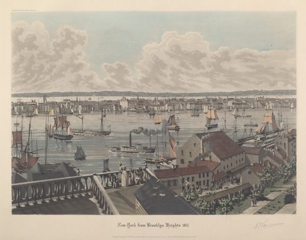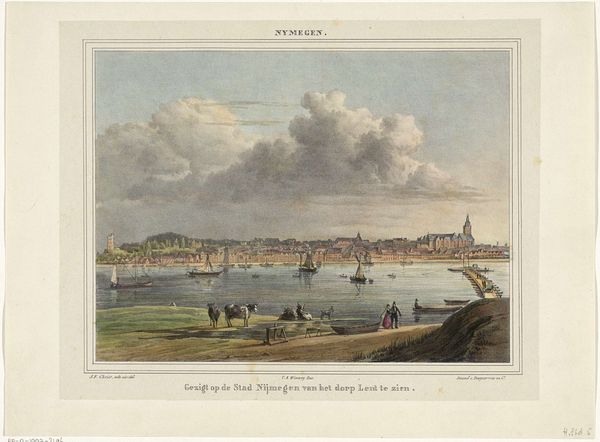 Editor: This watercolor and ink drawing, titled "The Departure of the Rotterdam Militia, Including a Large Number of Volunteers, in the Year 1830," was created by Quirijn Maurits Rudolf Ver Huell in 1830. It has a very documentary feel, almost journalistic, as it depicts this grand scene, though filtered through a romantic sensibility. How would you interpret the visual storytelling here? Curator: What stands out to me is the potent combination of civic pride and the anxieties of the period. Look at how Ver Huell uses the steamship, a modern marvel at the time, festooned with flags. It’s almost as if it is dragging a cluster of older boats. What memories or associations does this imagery invoke for you? Editor: It does strike me as a transitional image – the old and the new literally being pulled together. The artist's decision to use watercolor and ink, blending precision with a looser style, feels symbolic, mirroring the moment itself. Curator: Precisely! The flags, of course, are not mere decorations. They embody national identity, invoking loyalty. The mass of people signals solidarity and collective identity. This speaks to how carefully curated symbols construct cultural narratives, often during times of social and political change. How do you think the citizens would view this work when it was completed? Editor: I imagine it gave them a sense of patriotism. Something about it feels celebratory and yet perhaps tinged with uncertainty about the future. The smokestack even evokes an element of darkness, perhaps some foreboding. Curator: Foreboding, yes, or maybe simply capturing the industrial and societal shift that modernity portended. So even something like smoke can hold multiple meanings that reveal anxieties embedded within celebratory display. Examining visual languages uncovers collective psychological states. Editor: That's a powerful way to consider the emotional complexity held within even seemingly straightforward imagery. I’ll certainly think more about cultural memory and anxiety now when viewing similar works.