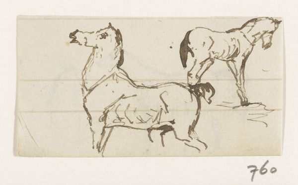 This is "Paarden," or "Horses," by Johannes Tavenraat, made in the Netherlands in the 19th century. It's created with pen and ink on paper. The quick, loose lines, the cropping, and the multiple studies on one sheet suggest the artist's fascination with capturing the animal's form and movement. Consider the cultural context: The 19th century saw significant developments in transportation and agriculture, where horses played a central role. Tavenraat’s study could reflect the growing interest in the animal's anatomy and its practical applications. These sketches also have a connection to art institutions of the time. The Dutch art academies emphasized rigorous training in drawing and anatomy. Animal studies were a common exercise for aspiring artists. To fully appreciate this work, we could explore the artist’s biography and the curriculum of the art academies. By looking into those resources, we can understand the artistic practices that shaped Tavenraat’s "Paarden."
