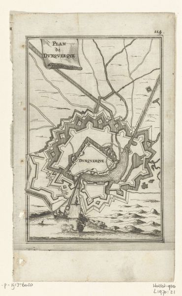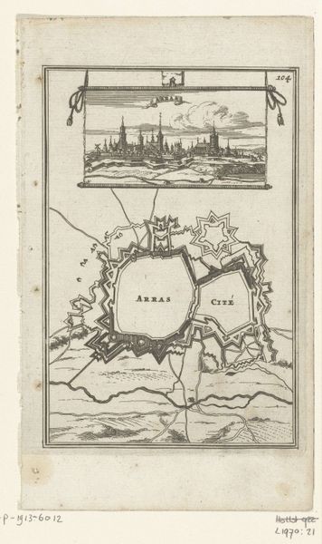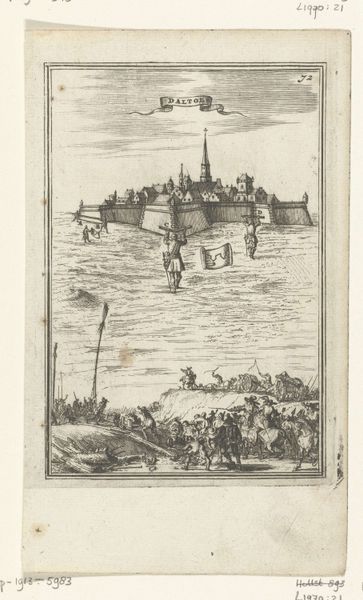 Curator: Let’s turn our attention to this detailed engraving titled "Illustratie voor 'Den Arbeid van Mars' van Allain Manesson Mallet" by Romeyn de Hooghe, dating back to 1672. It’s part of the Rijksmuseum’s collection. What are your first impressions? Editor: Stark geometry levitating above an organic landscape! The contrast is so immediate, it nearly overwhelms the representational aspects. The interplay of crisp, deliberate lines forming the aerial fortification and the softer, shaded textures defining the rock and structures below sets up a compelling visual dynamic. Curator: Precisely. Notice how the rigid lines defining the fortification contrast so sharply with the more free-flowing lines describing the landscape below, an artificial construct juxtaposed against the natural. The artist’s control of line weight contributes greatly to the clarity and depth of the composition. The line becomes almost a structural element in its own right. Editor: Indeed, this is about more than topography. That fortress above, viewed as though floating, suggests not only dominance and strategy in warfare – Mars, as the title suggests – but perhaps also hints at the detached, almost idealized planning that often precedes real-world application. Note the ox and figures; war isn’t just waged from a distance, but by those who are forced into labor. Curator: You're right to bring up the human element. Below, we see the implied toil – a direct contrast to the conceptual purity of the fortress design above. The cultural weight embedded in that visual tension between abstraction and labor cannot be ignored. Editor: It is striking, how the artist layers those cultural symbols; a warning against the ease of the strategists looking at the drawing compared with the labor of war, which falls onto those laboring the countryside, quite literally beneath the fortification, suggesting their structural and foundational role in the whole theater of war. Curator: Absolutely, and on a formal level, that stark division creates an unnerving balance that keeps drawing your eye between the realms of idea and execution. Editor: A clever balance. It invites further reflection on the distance between abstract intention and lived experience—the visual embodiment of theory and practice, perhaps. The fortitude needed to survive the Mars that lays ahead. Curator: And it’s in the interplay of these formal elements and symbolic layers where this engraving truly resonates. The artist manages to distill complex societal dynamics through precise, controlled mark-making and subtle contrast. Editor: Yes. The impact is immediate. A world above the world, literally held aloft, while life proceeds on the earth. Intriguing how historical cartography visualizes more than geography; it creates a visual echo of complex cultures and eras.