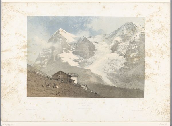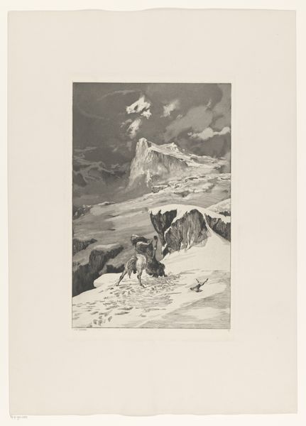 Editor: Eugène Cicéri's 1859 engraving, "Wandelaars op de top van de Mont Buet," really captures the sheer scale of the mountain. It's so interesting how small the figures look compared to the landscape. How do you interpret the symbolic weight of a work like this? Curator: This image presents us with a compelling tableau of humanity dwarfed by nature’s grandeur, a popular theme in Romanticism. Mountains themselves often function as symbols of the sublime, representing the awesome and often terrifying power of the natural world. The very act of ascending the Mont Buet takes on a symbolic quality, a pilgrimage of sorts. What emotional associations does this evoke for you? Editor: I see what you mean about pilgrimage, maybe the figures climbing evoke concepts such as determination, exploration or even spiritual ascent. Curator: Indeed. Consider the garb of these figures; they are not simply dressed for a hike. The clothing signals social standing, and perhaps, a deliberate engagement with the symbolic language of travel and exploration. It speaks to cultural aspirations of taming nature, a prevalent concept during the 19th century, with subtle colonial implications and class status signifiers. Editor: That's a great point! I hadn't considered the social implications embedded in the attire. It makes you wonder about accessibility and who could even attempt this climb. Curator: Precisely! And notice how the peak is bathed in light? Light as a symbol appears universally, here indicating clarity, knowledge and perhaps a divine connection accessed through conquering nature's challenge. The climbers strive for the summit to perhaps gain enlightenment, which serves as a testament to both individual ambition and a collective drive towards understanding our place within the universe. Editor: This was enlightening. It goes beyond a landscape image. Now, I’m reflecting upon ideas related to human ambition and class status, as well as our relationship with the environment. Curator: As you delve into the symbolic depth, it invites ongoing dialogue between us, the art and culture it represents, as well as our shifting perspectives.