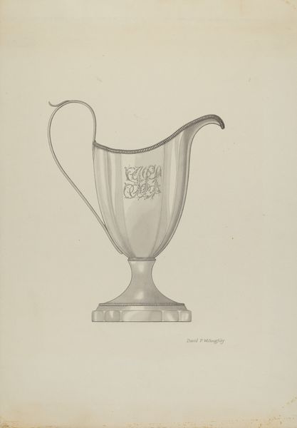 Editor: Here we have Herbert Russin's "Silver Hot Water Pot," created around 1936, a drawing rendered in pencil. There's a formality and an elegance to it. What cultural echoes do you hear in this piece? Curator: Elegance indeed! This drawing reminds us how everyday objects once possessed symbolic weight. Consider the hot water pot itself. Beyond utility, what does it signify about ritual, hospitality, and even social status? Notice the urn shape; does that tap into imagery of classical vessels? Editor: Absolutely! It's like a trophy or an ancient vase somehow got modernized. I also see art deco streamlined qualities in the handle and spout. Curator: Precisely. This blending suggests a continuity between past grandeur and present-day sophistication. Ask yourself, what kind of emotional weight does silver, as a material, hold in the collective memory of the 1930s? Was it a signifier of enduring value amidst economic uncertainty? Editor: So it becomes a symbol, perhaps, of wanting to hold onto better times? Curator: Or project an image of stability and refined taste during a time of change. The careful rendering in pencil further emphasizes the value placed on craft and detail, doesn't it? What’s more enduring than graphite? Editor: I never thought of that... Graphite as permanent memory. Thanks, I see it so differently now! Curator: As do I! Each time, the conversation with a piece and its audience unveils another facet, doesn't it?