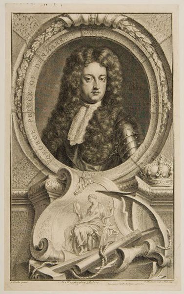 Editor: This engraving features Edward Russell, Earl of Orford, by Jacobus Houbraken. The detail is incredible! I'm struck by how the artist used line to create such a lifelike texture in his wig. What compositional elements stand out to you? Curator: The interplay of the oval frame and the cascading drapery introduces a dynamic tension. Note how the gaze directs us back into the pictorial space, preventing the composition from feeling static. Do you observe how this affects the overall reading of the piece? Editor: I see it now! The curve of the frame and drapery leads my eye from the Earl’s face down to the ornate cartouche. It keeps me engaged. Thanks! Curator: Indeed. Houbraken masterfully orchestrates these visual cues. A closer analysis of the engraving techniques may reveal even more.