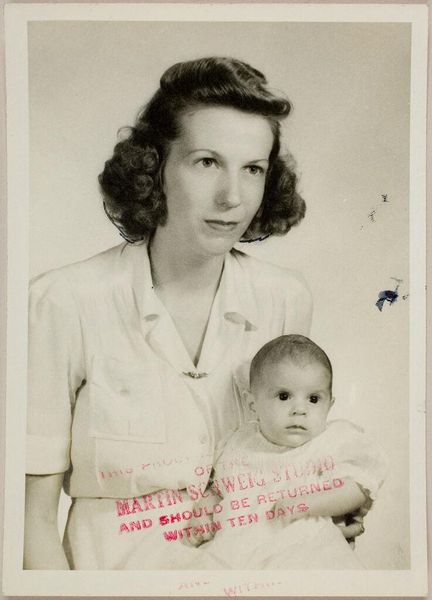 Editor: Here we have Martin Schweig's "Untitled (studio portrait of blond woman with young daughter in white dress)." I'm immediately drawn to the contrast between the mother's dark dress and the daughter's white one. What structural elements stand out to you? Curator: The formal arrangement certainly invites analysis. Note how Schweig uses light and shadow to define shapes, creating a composition where the figures are anchored by the tonal balance. Editor: So it's less about the subjects and more about how they are presented visually? Curator: Precisely. The print's surface, the careful posing, these elements construct meaning. We can appreciate it as an exercise in photographic form. Editor: That's a great observation. I was so focused on the subjects I missed the photographer's intentionality. Curator: By analyzing composition, we gain insight into the artistic choices at play.