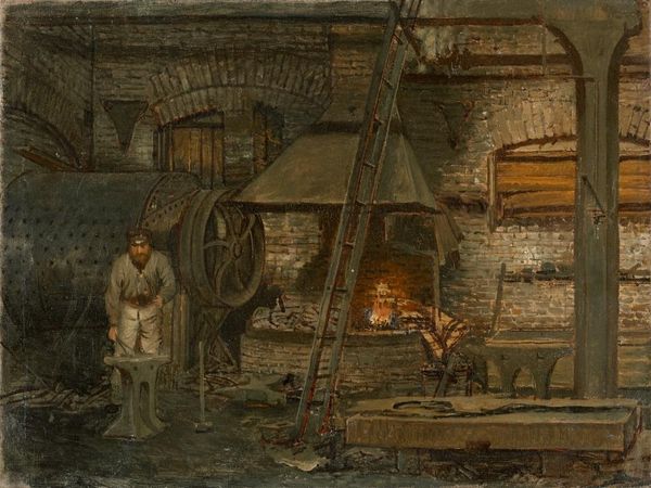 Editor: Here we have Peder Severin Krøyer’s “Burmeister and Wain Iron Foundry,” painted in 1885. The textures in oil paint almost feel heavy, mirroring the weighty subject matter. The atmosphere feels so charged; you can almost smell the hot metal! What captures your eye most about this work? Curator: You know, it's the glow that pulls me in – that inner, primal light. Krøyer hasn’t just depicted a foundry, has he? It’s almost as if he has captured some modern version of Hephaestus’s forge, the birth of something elemental. Don't you find a certain romance amidst the industrial scene, as if technology and humanity are somehow entangled? Editor: I hadn't thought of it that way! It is both grimy and romantic, a pretty strange combination! Almost like...an industrial fairytale. But how would one know that it's specifically Burmeister and Wain's Foundry just by looking at the image? Curator: Ah, that's the beauty of knowing the context, isn’t it? It’s not *just* a foundry; it is *this* foundry. It’s a snapshot of a burgeoning industrial powerhouse in Denmark, shaping not only metal but also the country's future. And, the artist actually captures the very real, sweaty and risky labour conditions. Do you get that sense? Editor: Absolutely. It's less about idealizing industry, and more about showing it as it was. Curator: Exactly! We often separate industry from art but I think it’s incredibly valuable that he does both simultaneously. What's amazing is how he transforms that everyday scene into something captivating, a little hellish and absolutely gorgeous at the same time. Editor: Well, now I definitely see this grimy landscape in a completely different light! It is more than just a factory. Curator: Indeed. Krøyer's ability to find the extraordinary in the ordinary truly sets him apart!