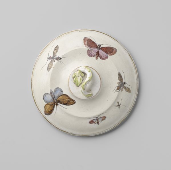Curator: Let’s take a closer look at this ceramic lid for a terrine, currently held at the Rijksmuseum. It dates back to the 1760s-1770s. The object features vibrant, polychrome decorations in a style reminiscent of Rococo. Editor: It’s visually so playful and rather elegant! The colours are just beautiful, and there’s a tactile quality that comes across, especially with the sculpted fruit at the center. Curator: Yes, it embodies the Rococo style through its decorative elements. Pieces such as these speak volumes about the elite dining culture during that period, particularly in Europe, with these elaborate dining sets symbolizing affluence and social standing. Editor: The craftsmanship seems incredibly skilled. One has to consider the materials they used. What type of clay, the origin of the pigments. This wasn’t mass production; each piece demanded individual artistry. These skills required years of apprenticing in specialized workshops, right? Curator: Absolutely. The production would've been part of a system tied to social mobility and recognition, with the ceramic workshop environment shaping the object's aesthetic and inherent value. The object is an artefact, a product of complex socio-economic relations. Editor: It also brings questions about functionality versus aesthetic value. How often would it have been used, versus displayed to indicate good taste? I am drawn to the contrast between the smoothness of the ceramic and the somewhat crude edges, revealing more about the hand of the artisan than the sleek facade suggests. Curator: A valid question, given how fragile and intricate these pieces are. In collections and displays like ours, it invites reflection on consumer culture then and now: we elevate them, analyze them, thereby re-contextualizing their social roles through their new public role as museum pieces. Editor: Indeed! The terrine is now divorced from its initial context, prompting one to reflect critically on the networks of craft, consumerism, and the presentation of artistic excellence in contemporary society. Curator: Thinking about this, it gives the ceramic work added weight. We've journeyed from material to meaning, from function to form and from the social sphere of the 18th century to its display as cultural heritage now. Editor: Indeed. The whole experience definitely reveals much more than just a beautiful decorative lid!