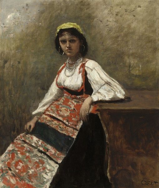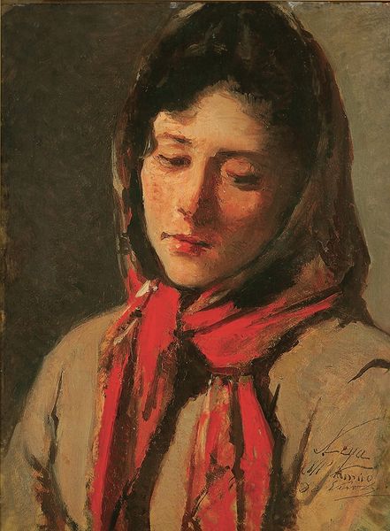 Editor: Here we have “Aïda, a Moorish Maid,” an oil painting by Sir John Lavery. I find the texture really interesting, especially in the clothing. What compositional choices stand out to you? Curator: Note the careful rendering of light and shadow across the sitter's face. Observe how Lavery has built up layers of paint to create a sense of depth, primarily focusing on her serene expression. Does the impasto of the garments detract, or contribute to, the image’s pictorial strength? Editor: I think the layering on her dress works because it contrasts with the flatness of the background, but do you think there could have been a different approach to how Lavery applied paint here? Curator: One might argue that the controlled brushwork used in her face better serves Lavery's project. Her composed look meets the viewer, while also inviting us to engage with formal choices rather than with some historical interpretation. Is the gaze not primary? The subject’s ethnicity only contextual? Editor: So you’re saying the technique invites us to focus on the subject as an individual rather than a symbol? Curator: Precisely. The very nature of portraiture—the construction of identity—is at play here. The texture, the color, the carefully planned composition—all converge to create a potent image, regardless of who, or what, she represents culturally. Editor: That’s a completely different way of seeing it. I appreciate your insights into the compositional elements. Curator: And I appreciate you challenging me to consider a different vantage.