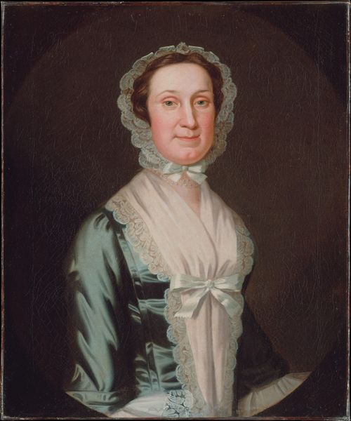 Editor: Here we have a portrait of "The Right Honourable Selina, Countess of Huntingdon," painted in oils by John Russell. She looks like a serious woman, gazing thoughtfully, perhaps after finishing the book that’s resting near her elbow. What can you tell me about her? Curator: What I see is a portrait of a powerful woman, presented within the aesthetic constraints of her time, but whose agency manifested through religious reform and social impact. Selina Hastings wasn’t just a Countess; she used her wealth and position to become a major figure in the 18th-century evangelical movement. How do you see the tension between her aristocratic status and her religious conviction expressed in the portrait? Editor: That's interesting. I see the aristocratic part in her fine clothing and refined pose, but what clues point toward her religious convictions? Curator: Look closely. There's a deliberate plainness to her dress, a stark contrast to the extravagant fashions of the aristocracy. The muted color palette and the simple bonnet, even the book itself, signal piety and a turn away from worldly vanity. This 'visual rhetoric' of humility was a conscious choice, used to amplify the Countess's moral authority at a time when aristocratic women had limited agency. The book suggests learning but might be also the Bible. This wasn't just about faith; it was about using faith as a lever for social change. What message do you think a contemporary audience would have received? Editor: So, the painting is not just a portrait, but a carefully constructed message about her identity and purpose. Fascinating. Curator: Exactly! And recognizing that helps us unpack not only her individual story, but also the broader history of women, religion, and power. Editor: I'll definitely look at portraits differently now, thinking about the narratives they are crafting. Thanks!