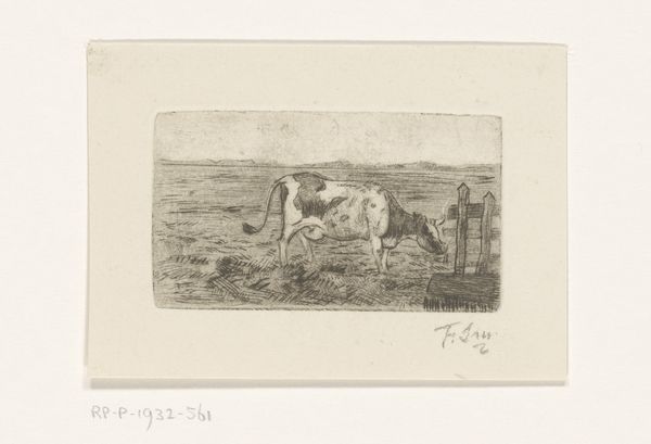 Editor: Here we have Frans Smissaert's "Paard," created sometime between 1872 and 1932. It’s an etching, a type of print. I find the texture really striking – a little rough, maybe even melancholy. What draws your eye to this piece? Curator: It's fascinating to consider the cultural context surrounding such a work, especially regarding the social status of animals within agriculture and industry at the time. Does this portrayal challenge or reinforce societal hierarchies present at the turn of the century, concerning labor and the landscape? Editor: That's an angle I hadn't considered. It seemed a straightforward, bucolic scene. Is the implication that this simple image could actually be making some kind of political statement about labour or ownership? Curator: Not overtly, but the very act of representing a working animal gives it visibility, acknowledges its existence. What decisions have gone into who is viewing it, who is benefiting, and where it may be shown? Does this not reflect existing biases within the institutionalized art world? Editor: So, by placing a horse in an art context, the artist might be subtly raising questions about its role and value in society. I had not appreciated the power dynamics at play. Curator: Precisely. And let's not overlook how the Rijksmuseum's decision to display this work shapes its interpretation today. Is it simply art, or is it a reflection of a particular historical perspective approved of by that institution? Editor: Wow, I hadn’t thought about how even just showing something in a museum gives it another whole layer of meaning. Curator: Exactly. Every choice, from the artist’s to the museum's, reflects a complex interplay of social, cultural, and institutional forces. This piece, seemingly simple, is loaded with them. Editor: That really changes how I view this artwork. Now, seeing it, it makes me curious about the people and structures that surround and influence this piece. Thank you.