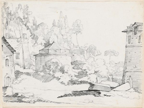 Editor: Here we have Joseph Marie Vien's "Corner of an Italian Garden with a Church Beyond," likely sketched between 1744 and 1750. It's a pencil drawing and it almost feels like a preliminary sketch for a larger work. What jumps out at you when you look at it? Curator: What strikes me is Vien's choice of such a commonplace scene and how he uses this rather raw medium, pencil on paper, to represent it. Here's an artist, clearly capable of high academic polish, using a relatively inexpensive material to capture, perhaps, an honest glimpse of the built environment. Where does the "art" reside then? Is it the architectural scene that possesses innate aesthetic properties or is it in the labor that the artist invests in its recording? Editor: So, the material informs the reading of the artwork, right? Are you suggesting the rough medium allows for a different kind of engagement? Curator: Exactly! Consider the context: this isn't an oil painting meant to impress a wealthy patron. It's a drawing, potentially for study or personal reflection. The artist's labor is very apparent in the visible pencil strokes, which allows us to see process. What purpose does the garden serve beyond visual delight? How is it maintained, who benefits from its produce, what value does that produce hold, what structures would serve that production? This becomes visible. Editor: That's fascinating. So instead of just seeing a pretty landscape, we can ask about labor and the means of creating this idealized scene. Curator: Precisely. And notice how even the statue in the garden is rendered without idealization – it's integrated into this system of production as much as the building in the back and the tree is as part of materialist creation as the artwork in front of it.. Editor: I see it now! Thanks, that perspective really helps me see the drawing differently. Curator: My pleasure; hopefully it offers new questions for approaching art making overall.