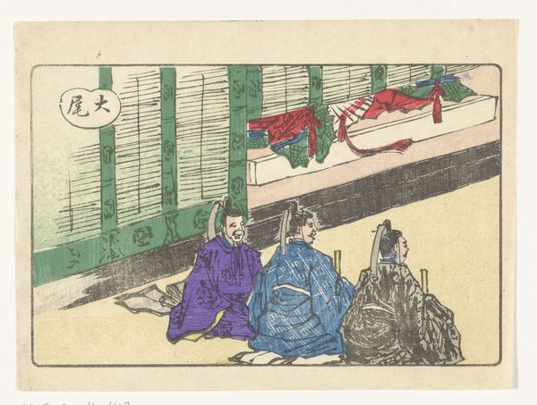 Editor: This is “Hovelingen,” a woodblock print in ink by Kawanabe Kyōsai, created sometime between 1870 and 1880. It’s currently at the Rijksmuseum. What strikes me is the almost cartoonish simplicity, and yet there's an undeniable charm to these figures. What do you make of it? Curator: Charm indeed! It’s like a visual poem, isn't it? I think Kawanabe Kyōsai's genius was in capturing a fleeting moment with such playful lines. These figures aren’t striving for realism, they’re almost caricatures, and that’s what gives it that disarming, immediate feel. Do you get a sense of narrative from their poses and interactions? Editor: I do. The woman holding the box, it feels ceremonial, almost like a gift-giving scene. But it’s hard to decipher any specifics. Curator: Exactly! Kyōsai gives us just enough to spark our imagination. His earlier works were rather formal, yet late in life his pieces seemed to take a life of their own, incorporating social commentary, caricature and humor! The setting is vague, which is interesting because Ukiyo-e, the style, is know for depicting “everyday life”. What do you think it meant in those days to see something like this versus another style of print? Editor: I imagine it might have been refreshing to see art that poked fun at the world, instead of always idealizing it. I guess the artist offered the public an unvarnished reality. Curator: Precisely! It’s a reminder that even within formal artistic traditions, there’s always room for a bit of mischievous fun, some delightful irreverence. A window into the soul of the Edo period, perhaps? Editor: Definitely gave me something to think about. The piece felt approachable because of the sketchy aesthetic. Curator: It's a beautiful way to learn, connecting with something seemingly simple, but finding so much depth hidden just beneath the surface.