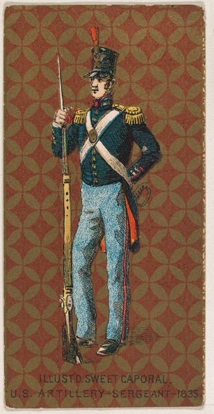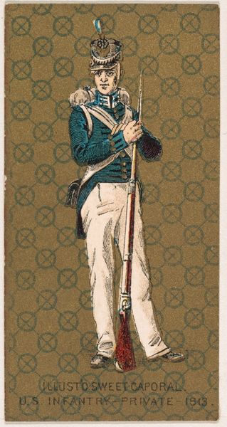 This ‘Infantry, United States Army, 1810’ card was made by the Kinney Tobacco Company to promote Sweet Caporal Cigarettes. It is made of paper, and would have been printed using chromolithography, a method that allowed for the mass production of color images. As we contemplate this small paper rectangle, it is easy to forget that it reflects much larger economic systems. It may seem a far cry from the battlefield to a pack of cigarettes, but the links are there: the tobacco industry fueled by mass consumption, the military protecting American economic interests. This card represents the industrial processes that drive both. It is not fine art, but rather ephemera, a minor artifact. Yet, even through its disposability, the image provides a glimpse into early 19th-century American identity, and the ways in which images like this one help to shape our understanding of history.