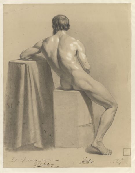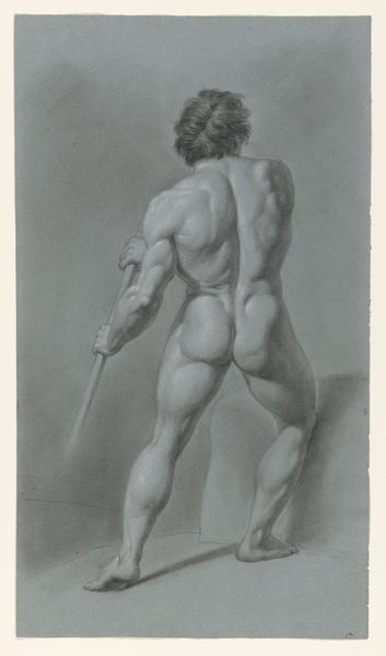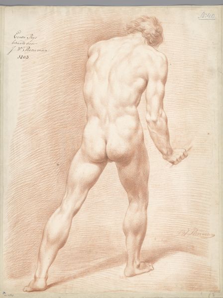 This drawing of a standing male nude, seen from the back, was made by A. Waterloo, using a reddish-brown chalk on paper. The artist's choice of material is critical here. Chalk lends itself to blending and shading, allowing Waterloo to capture the subtle contours of the figure's musculature. The texture of the paper also plays a role, creating a soft, slightly granular effect that enhances the sense of depth and volume. The drawing is a study, likely made in preparation for a larger painting or print. It reflects the academic tradition of studying the human form, which was central to artistic training at the time. The artist's skill in rendering the body is evident, but the drawing also reveals the labor and discipline involved in mastering this skill. In the end, it reminds us that even the most seemingly effortless works of art are often the result of sustained effort and careful attention to materials and processes.