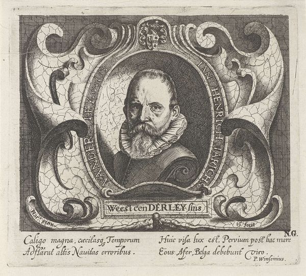 Editor: Here we have Gaspar Bouttats’ "Portret van Alexander Farnese," dating from somewhere between 1650 and 1695. It's an engraving, and the detail is really striking, almost photographic in its precision. The subject’s ruff and armor especially command attention. What structural elements do you notice first in this composition? Curator: The carefully constructed layers, achieved with cross-hatching, create a compelling textural interplay. Observe how the oval frame softens the rigidity of the outer rectangle, introducing a visual rhythm. Consider how the portrait bust echoes the shield, balanced by two horns, at the top and bottom of the image. Editor: That’s a really interesting observation. The composition feels very balanced and intentional. Can you tell me more about this “visual rhythm?" Curator: Bouttats's lines aren't merely representational; they're constitutive of a deeper structural harmony. See the repetitive circular forms within the frames, the horns, the foliage. The use of hatching establishes tonality through varied intensity across shapes. Does the artist make any intentional departures? Editor: I suppose the armor breaks the patterns. Instead of soft curves and decorative patterns, the metal introduces many short, straight, and seemingly haphazard marks. It is set off from the background more sharply, perhaps alluding to the weight and unyielding nature of military gear. Curator: An acute observation. Bouttats deliberately interrupts this harmony by use of asymmetry in line direction in specific components of the frame around the portrait’s central figure. Note the deviation in the texture and tonal balance between areas such as the top ornaments with flowing tapestry and areas in bottom with coat of arms. Editor: I never would have looked so deeply! Now I realize that breaking the patterns is not a failure but is strategically meaningful. Curator: Indeed. Through acute awareness, visual perception can lead to discovery.