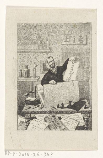 Curator: Oh, hello there. I’d like to draw your attention to this photograph: “Mathias Häusermann.” We believe it was created sometime in the 1850s or 1860s. What catches your eye first? Editor: What strikes me is this rather dramatic tableau! He seems lost in thought amidst these symbols of… well, knowledge, death, and perhaps military might? It’s a potent cocktail. Curator: Exactly! Häusermann was, as far as we know, a man deeply engaged with the political upheavals of his time. The props here – globe, clock with skull, sword, and scholarly books – feel staged to signify his multifaceted intellectual pursuits. It’s very much about constructing an image, isn’t it? The trappings of enlightenment weighing on the subject’s soul. Editor: Heavens yes, the heavy load of being 'learned'. Look at how precariously that open book lies, and how that sword seems just flung down – very Romantic gesture about the futility of...everything, really. Even the coloring of the print itself, that pale cast, hints at this melancholy. The skull perched atop the clock—is that supposed to indicate how every hour moves you closer to death? Curator: Precisely. While it is undoubtedly a product of its time – constructed and slightly artificial, certainly not candid, though leaning into history-painting—it reflects those very real social currents that romanticized the intellectual and the politically engaged, seeing in them the potential for monumental, history-altering actions. The globe, of course, hinting at worldwide awareness and knowledge. Editor: Which he carries around in his mind along with this suit, tie and sword! So you'd wager all the artifacts were chosen deliberately to create a particular impression of enlightened weariness with, I guess, worldly concerns. Do you think it might have worked on its contemporary audience? Curator: Undoubtedly, I imagine portraits like these gave people permission to dream of more for themselves—intellectually and socially. He wasn’t just Mathias Häusermann; he was Häusermann, the deep-thinking world-changer. Though he is just kind of hanging back in a daze here as his entire study attempts to bury him alive. I'm going to go do some deep thinking now—perhaps in a coffee shop instead! Editor: Perhaps without a skull as a table decoration! Fascinating perspective, especially within its social environment. I appreciate having considered it from such a political angle. Thanks!