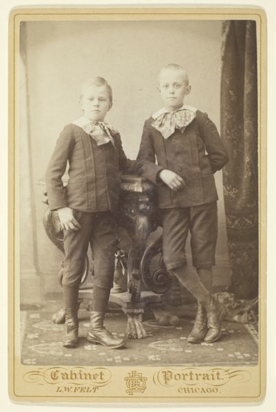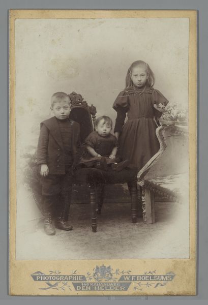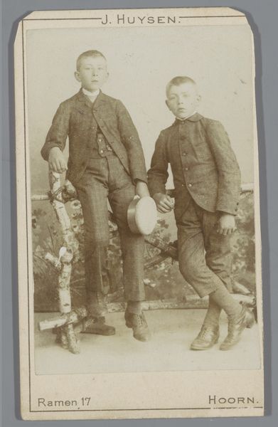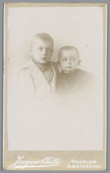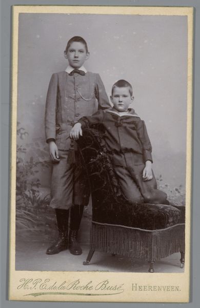 This is a studio portrait of two boys, made by G. A. Vernout in Haarlem, likely in the late 19th century. The sepia tones and formal composition speak to the conventions of studio photography at that time. These boys, neatly dressed with pocket watches, are clearly from a well-to-do family. The studio backdrop, suggesting an outdoor scene, was a common feature, allowing families to project a certain image of themselves. Consider the rise of the middle class in the Netherlands during this period, and how photography served as a tool for social climbing and the construction of identity. Photography studios sprang up in cities like Haarlem, catering to this desire for portraiture. To understand this image better, we might delve into archival records of Haarlem's photographic studios. By examining these resources, we can uncover the social and economic forces that shaped both the production and consumption of images like this. Only then can we grasp its full historical significance.