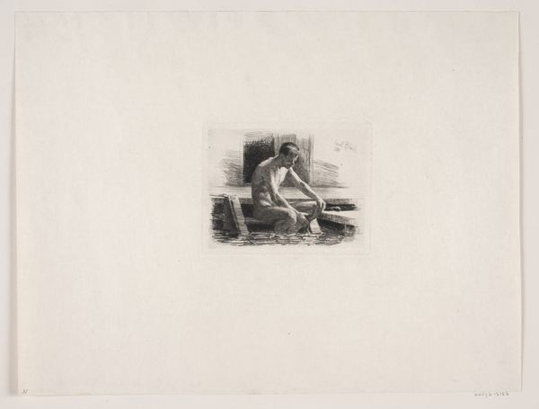 This small etching, "En lille bondedreng" or "A Little Farm Boy," was created by Otto Haslund, an artist born in Denmark in 1842. The image depicts a young boy wading through a stream, carrying a fishing rod and what appears to be a basket. Haslund was working during a period of significant social change in Denmark. As industrialization progressed, there was a growing interest in romanticizing rural life and its inhabitants. The image participates in an idealized vision of childhood, one closely tied to nature and simplicity. The emotional weight of the artwork is carried by the quiet solitude of the boy, framed by the surrounding trees. "En lille bondedreng" can be seen as a reflection of the societal values and romantic nationalism prevalent in Denmark at the time. The image captures the anxieties and desires of a nation grappling with modernity.