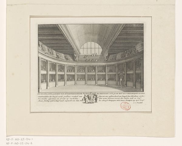 Editor: Here we have, "Galerij in de Vaticaanse Bibliotheek," or "Gallery in the Vatican Library," made sometime between 1794 and 1795. It’s an etching and print that reminds me of an architectural rendering with these receding arches. It's incredibly precise. What stands out to you? Curator: It's fascinating how this print showcases the Vatican Library not just as a repository of knowledge, but as a stage for power. Notice how the architecture dwarfs the figures. This wasn't simply about depicting a space; it was about conveying the authority and enduring legacy of the Catholic Church during a time of revolutionary upheaval in Europe. What do you think this emphasis on grandeur aimed to achieve? Editor: Well, making the people appear so small certainly emphasizes the institution's dominance. So, was this image, in a way, propaganda? Curator: You've hit on a key point. Consider the rise of Neoclassicism and its use by powerful entities. The Vatican Library, presented in this idealized, almost pristine manner, serves as a counterpoint to the instability brewing outside its walls. By showcasing order and timelessness, it subtly asserts the Church's unwavering role. Think about how visual culture operated in that period. Editor: That’s a perspective I hadn’t fully considered. Seeing it now, it feels like less of a neutral depiction of a space and more of a strategic declaration of cultural and political strength. I guess even seemingly simple architectural prints can have loaded meanings. Curator: Precisely. Understanding art requires us to be aware of its socio-political context and how institutions shape its creation and reception. Hopefully, this has offered a new insight into that dynamic.