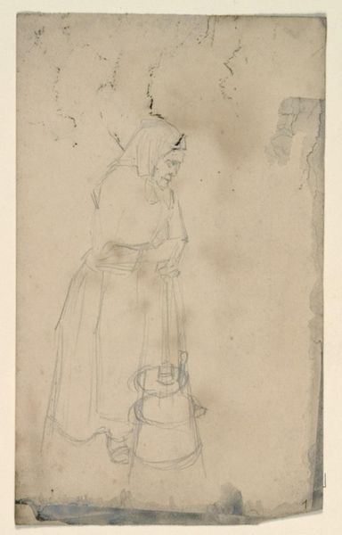 Editor: So, this is "Two Male Figures" by Johannes Tavenraat, created after 1854. It’s a drawing with ink on paper. It feels like we’re peering into the artist’s private sketchbook… almost like glimpsing thoughts as they emerge. What strikes you about this piece? Curator: You're right; it's a wonderfully intimate peek into Tavenraat's world. I find myself pondering what captivated his attention enough to sketch these figures, especially with such swift, economic lines. Look at the upper figure—the turn of the head, the drape of the garment. There’s an implied narrative, isn't there? A story almost whispered onto the page. Editor: Definitely. I also notice the text annotations on the right side of the work that give context clues. The figure up top also appears to be leaning on a staff, I wonder why... what is your opinion on that element? Curator: That is indeed one clue, isn't it? It might be the casual nature of someone resting or more evocative of travel. To me, there's something wonderfully unfinished about it, which allows us space to invent our own stories for these figures. You see a traveler there, but who might they be, and what are they thinking about? Editor: Perhaps they are on a journey. Curator: Exactly. The way that Tavenraat just hints at detail actually sparks my imagination *more*. It makes me feel complicit in the art-making, as I actively fill in the narrative gaps. It's quite liberating! Editor: That's a fantastic point. I initially saw just a simple sketch, but now I see this invitation to collaborate, to build a world around these suggestive lines. It’s not just looking; it’s participating. Curator: Yes! It transforms from observation to co-creation, a beautiful silent dialogue across time and paper. It also reminds me not every work is a masterpiece but a glimpse of someone, somehow, thinking and being alive. That's rather precious. Editor: That's a wonderful perspective. It definitely shifted how I'll approach similar works from now on. Thank you for sharing!